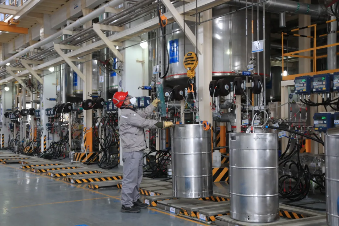 1月30日,在明溪縣經濟開發區內的海斯福高端氟精細化學品生產項目一期鋰電池電解液生產車間,工人們正在忙于電解液生產和分裝轉運。